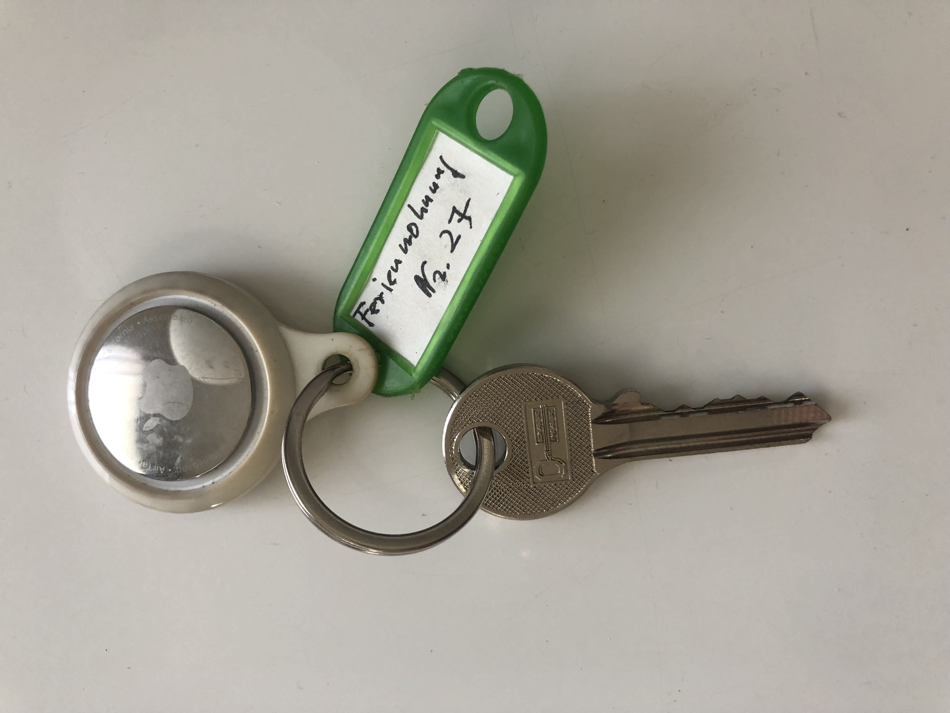 Hinweis: An beiden Schlüsseln ist ein AirTag von Apple angebracht. Dieser dient dazu, im Falle eines Verlustes des Shclüssels eine Chance zu haben diesen wieder aufzufinden. Wenn Sie nicht möchten, dass wir nachverfolgen können wo sich der Schlüssel befindet, können Sie die Tracker natürlich für die Dauer Ihres Aufenthalt vom Schlüsselbund entfernen. Wir empfehlen aber, die Tracker am Schlüsselbund zu belassen.